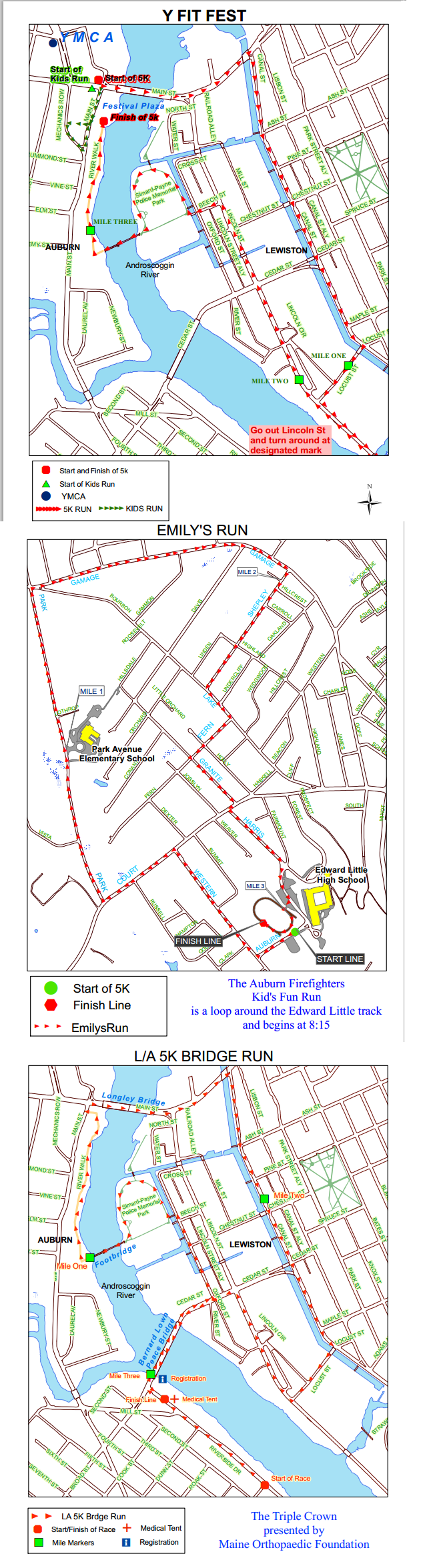 The Triple Crown is a running series in Lewiston/Auburn, Maine; consisting of three 5K races (YMCA Fit Fest-June 8, Emilys Run-July 20 and The Bridge Run-August 24) held throughout the summer, open to runners and walkers of all ages and abilities. Participants can run an individual race or run all the races in the Series!